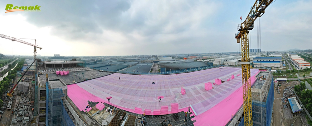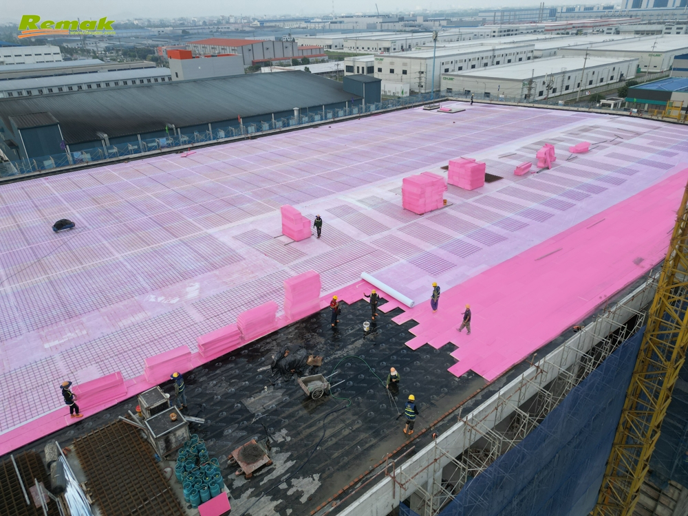 Hạng mục cất nóc nhà xưởng do Công ty TNHH Xây dựng Hoa Việt (Huayue Construction Industry Company Ltd.) thi công. Remak® XPS là vật liệu xanh và là thành phần không thể thiếu được trong quá trình xây dựng các công trình xanh. Vì vậy, sản phẩm của Cty CP Xây dựng & Nội thất Remak sản xuất được lựa chọn sử dụng bởi chất lượng vượt trội; khả năng cách nhiệt, cách âm, chống đọng sương, chịu nén tối ưu; giá thành hợp lý. Anh Nguyễn Đình Cường (Công ty TNHH Xây dựng Hoa Việt) – Chỉ huy trưởng tòa C2, Dự án Nhà máy Sản xuất tai nghe, dây kết nối New Wing nhận định: “Xốp XPS của Remak có trọng lượng gọn nhẹ, vận chuyển dễ dàng, thi công nhanh chóng; giúp chúng tôi làm việc rất thuận lợi, đạt hiệu suất cao và chắc chắn cũng sẽ góp phần nâng cao tuổi thọ bền bỉ cho cả công trình nhà máy!”.