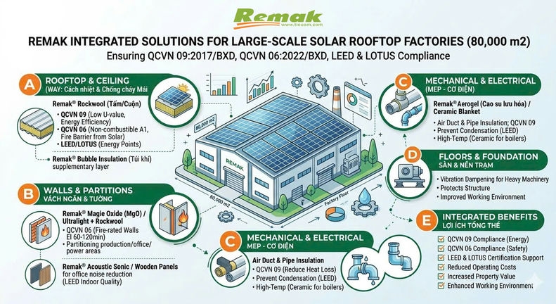 Điều này đặt ra yêu cầu cấp thiết về một hệ giải pháp vật liệu đồng bộ, không chỉ đảm bảo hiệu quả cách nhiệt mà còn phải đáp ứng các tiêu chuẩn về an toàn cháy nổ và hiệu suất vận hành. Trong bài viết này, Remak giới thiệu giải pháp vật liệu tổng thể: vật liệu cách âm, vật liệu cách nhiệt, vật liệu chống cháy dành cho nhà xưởng rooftop solar, đáp ứng đầy đủ các quy chuẩn như QCVN 09:2017/BXD, QCVN 06:2022/BXD và các tiêu chuẩn công trình xanh như LEED và LOTUS.