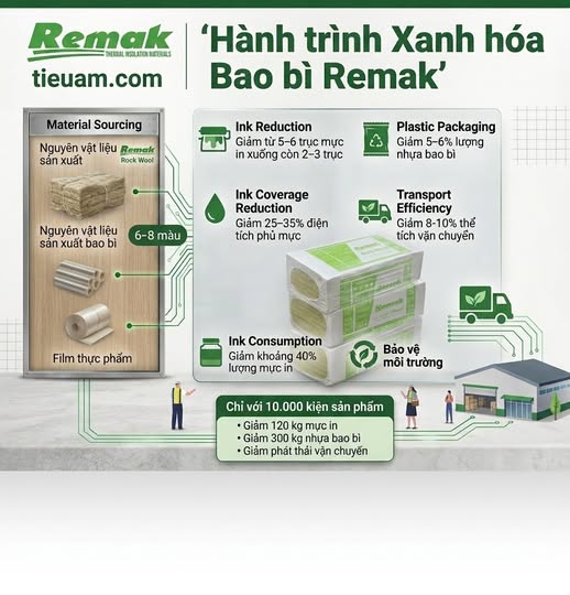 Remak tối ưu bao bì bông khoáng Rock Wool nhằm giảm lượng mực in, giảm nhựa bao bì và tối ưu vận chuyển. Hành trình xanh hóa bao bì góp phần xây dựng hệ sinh thái vật liệu thân thiện môi trường.