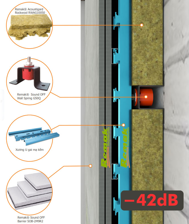 Một hệ vách cách âm khác có sử dụng lò xo giảm chấn cách âm cho tường