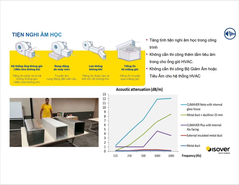 Tiện nghi âm học cao cấp, kiểm định theo tiêu chuẩn EN ISO 354. Hệ số hấp thụ âm đạt 0.85 và khả năng giảm âm lên đến 12 dB/m.