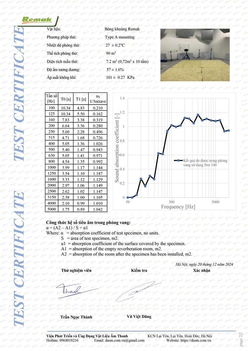 Kết quả thử nghiệm hệ số hấp thụ âm của sản phẩm Bông khoáng cách âm tiêu âm Remak® Rock wool tại Viện DASM