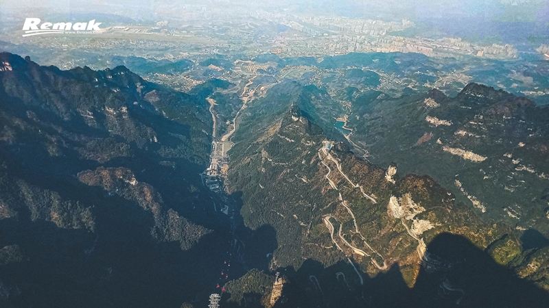 Trong khi đó, với chiều dài 11km cùng 99 khúc cua hiểm trở, Thiên Môn Sơn (nằm ở vườn quốc gia Thiên Môn – Trương Gia Giới) – Top ngọn núi nổi tiếng nhất xứ Trung được mệnh danh là một trong những cung đường nguy hiểm và khó chinh phục bậc nhất. Đoàn Remak đã có một buổi chiều đáng nhớ khi di chuyển bằng cáp treo gồm tất cả 98 cabin có tổng chiều dài 7.455m để đặt chân lên "cổng trời". Nhiệt độ giảm trung bình 10°C so với TP. Trương Gia Giới và bồng bềnh mây phủ. Con đường trong suốt Skywalk được làm từ kính cường lực, ôm sát vào vách đá dựng đứng, đem lại cảm giác thích thú xen lẫn hồi hộp. Cùng với đó là không khí trong lành, thoáng đãng; sắc trời xanh biếc; khung cảnh hùng vĩ trập trùng của non nước hữu tình... dễ dàng gợi nhớ đến hai câu thơ tuyệt tác của Chủ tịch Hồ Chí Minh: “Cao sơn hữu ý thiên niên bút/ Lưu thủy vô thanh vạn cổ cầm.” (Núi cao có ý như cây bút ngàn năm/ Nước chảy không nghe tiếng nhưng lại là cây đàn muôn thuở).