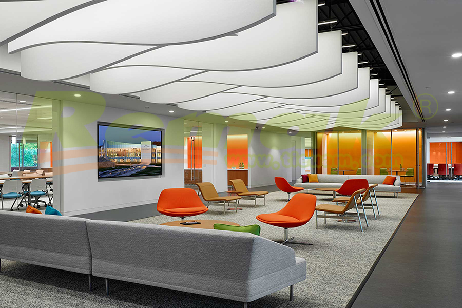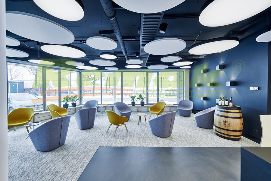 Các tấm tiêu âm hình đám mây thường được treo song song với trần nhà, và chúng có thể hấp thụ sóng âm thanh trong và ngoài phòng nhờ 2 đặc điểm sau: