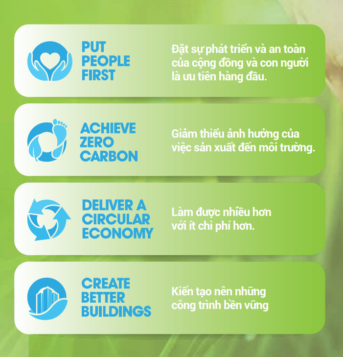 “Cho một thế giới tốt đẹp hơn” là SỨ MỆNH tạo dựng nên sự thành công của chúng tôi. TẦM NHÌN của chúng tôi là dẫn đầu trong công cuộc tìm kiếm các giải pháp cách nhiệt sạch và an toàn – cách âm hiệu suất cao, cho một thế giới tốt đẹp hơn. Chiến lược tham vọng cho tương lai của chúng tôi tập trung vào 4 MỤC TIÊU BỀN VỮNG chính: