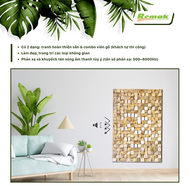 Mỗi viên gỗ thông vát chéo đầu có kích thước 56x56x50mm; vân gỗ mềm mại, độc đáo; phản xạ và khuyếch tán được sóng âm thanh một cách tùy ý (tần số phản xạ: 500–8000Hz). Tranh gồm 2 phiên bản: đã hoàn thiện và combo tự chọn để khách tự thi công tại nhà. Chúng sở hữu công năng làm đẹp; cải thiện chất lượng âm thanh – độ rõ của lời nói tốt hơn; giảm thiểu tiếng ồn ở những khu vực công cộng, phòng hội nghị; chuyên dụng tán âm, tạo ra trải nghiệm âm thanh sống động, cân bằng...