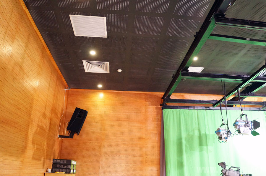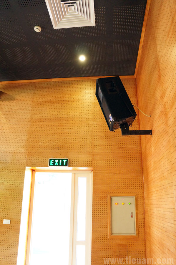 Trần được xử lý tiêu âm bằng tấm sợi khoáng tỷ trọng 100kg/m3 bọc vải tiêu âm Soundtex, bề mặt hoàn thiện thạch cao đục lỗ tiêu âm